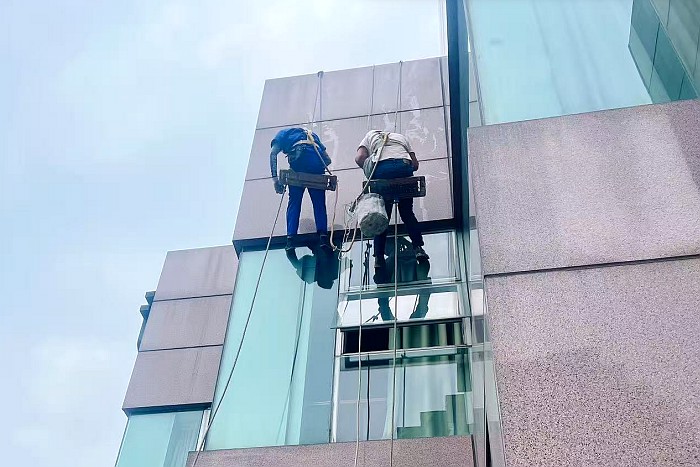 考虑到建筑高度约140米,屋面设备布置密集且作业空间有限,经多方案论证,最终选用“蜘蛛人”高空作业方式,并通过搭设脚手架安全通道、设置围挡区域,地面配备专职安全管理员进行风险预判与人流疏导的方式,构建起全方位、立体化的安全防护网络,切实保障了解放碑商圈游客与行人安全。在近两个月作业期间,无论是酷暑还是阴雨天气,市建科院检测团队始终坚持作业,严控质量、保障进度,如期顺利完成了全部检测任务。