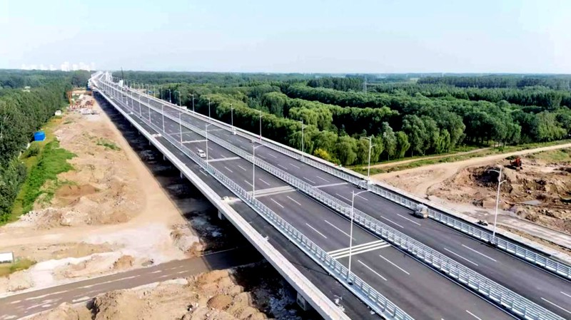 市建科院代建路段全长5.3公里,始于河北省廊坊市香河县钳屯镇双安新城西侧的国道G230钳屯弯道,止于国道G230与乡道老夏安线的交汇处。项目的核心为全长2909.5米的北运河特大桥及引桥工程,包含一座长度280米跨越北运河的主桥。全路段按照一级公路标准进行修建,路基宽度为45米,配备机动车双向六车道,并前瞻性地设置了独立的非机动车道及人行道,设计时速为80公里。