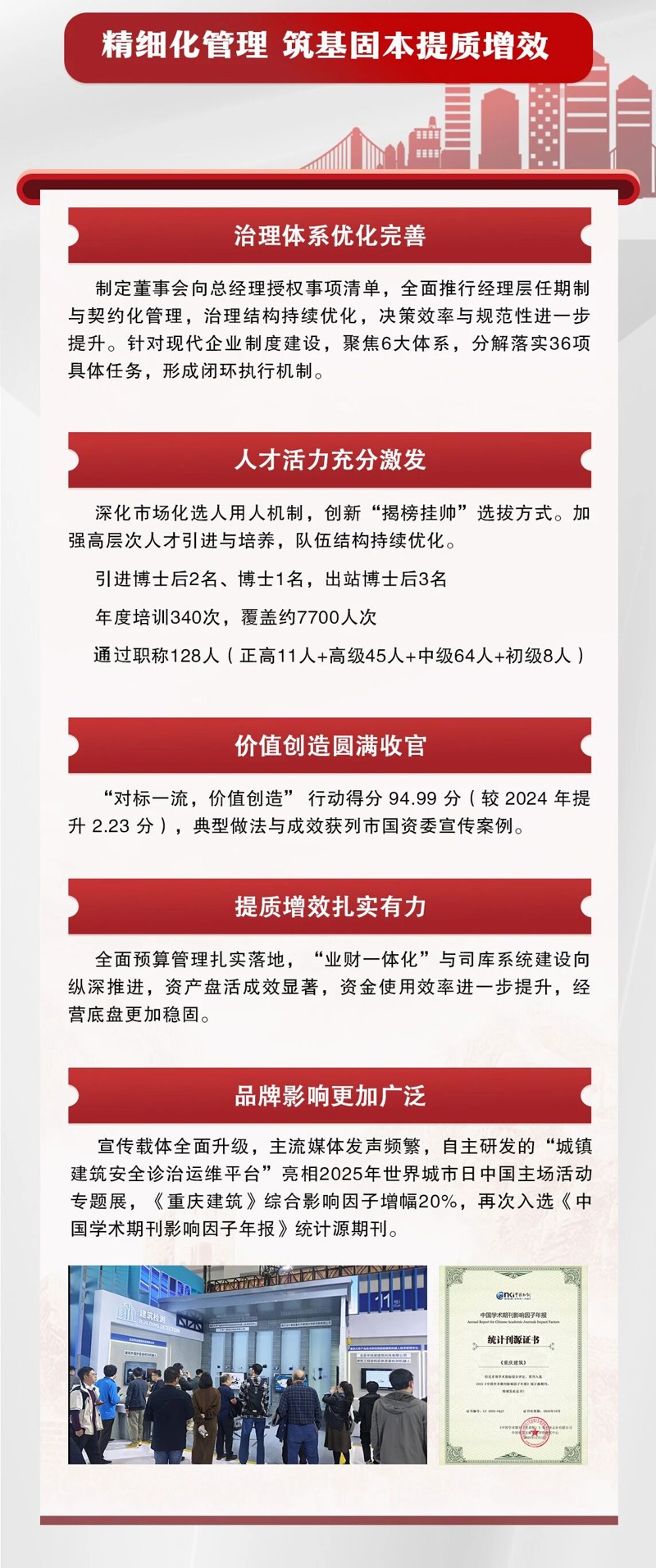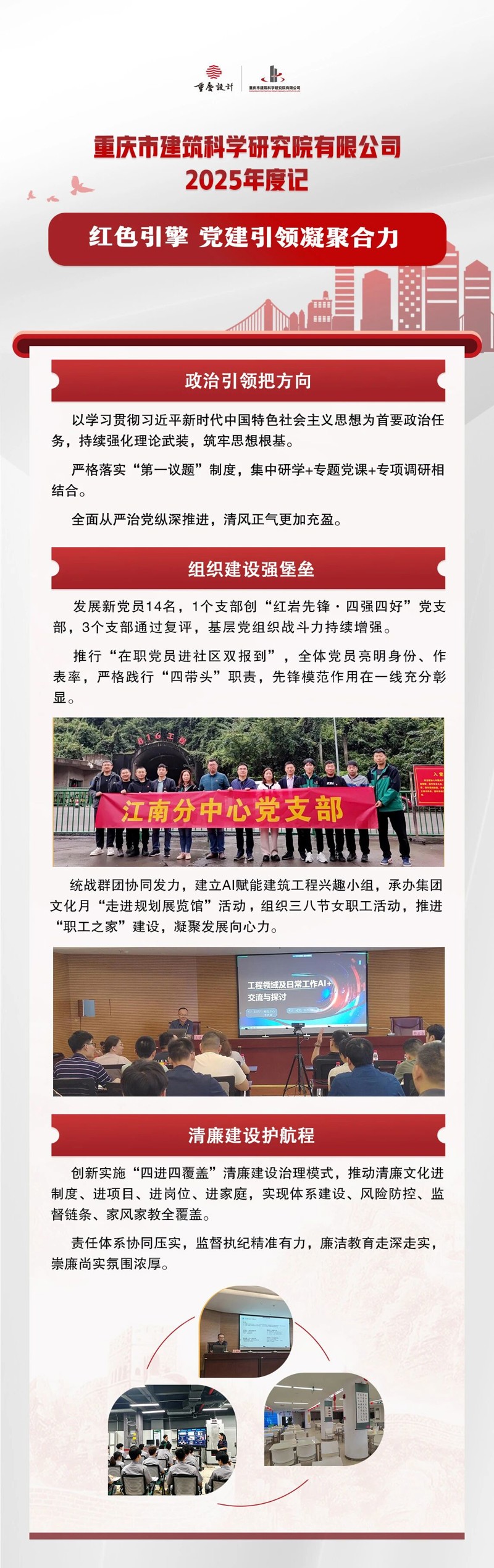 2025年,重庆设计集团市建科院内部融合持续深化,业务布局不断完善,核心能力稳步增强,风险防线更加牢固,党建与业务同频共振,发展基础坚实稳固。